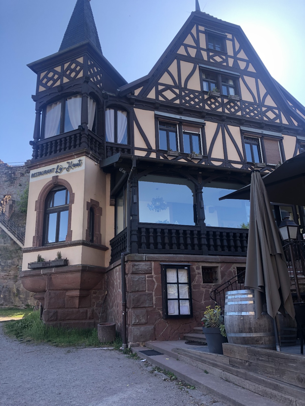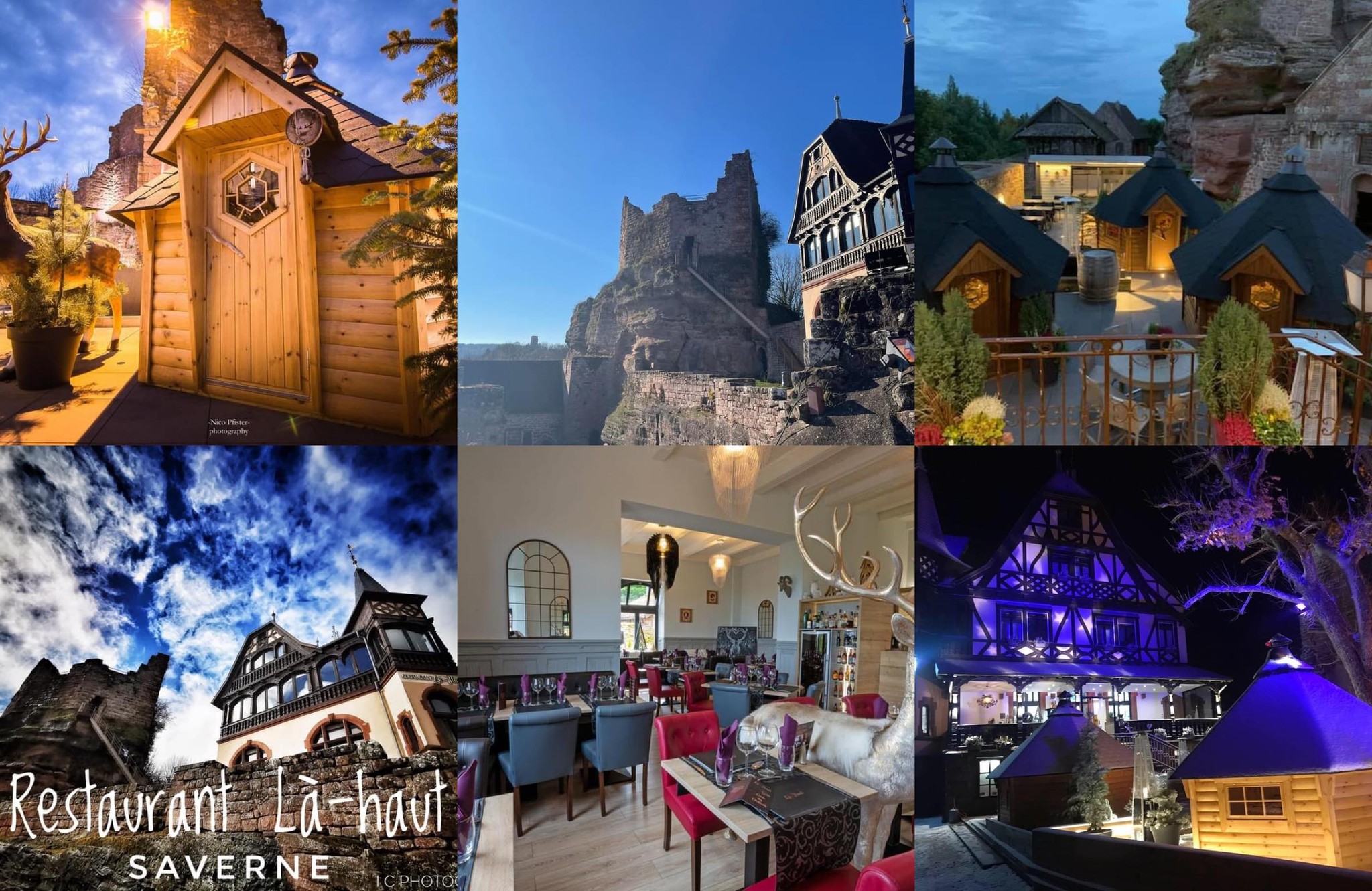 Du Château du haut-Barr érigé au VIIe siècle ne restent malheureusement qu’un logis seigneurial et une chapelle romane. C’est pourquoi le restaurant « Là-haut », avec son architecture mêlant poutres en bois sombre et gré rose, s’intègre parfaitement au lieu. On retiendra également sa large terrasse, implantée dans la cour de l’édifice. Entourée par les remparts du Château, elle offre à ses convives un espace de fraîcheur bien agréable pendant les vagues de chaleur estivale. Si on y retrouve immanquablement bon nombre de touristes, les locaux prennent également plaisir à s’y rendre. Ces derniers ont également pris l’habitude de privatiser la salle panoramique de l’établissement, pouvant recevoir jusqu’à 30 convives. Offrant une vue majestueuse sur la plaine d’Alsace, elle est particulièrement prisée pour les mariages, les communions et autres réunions de famille. Et en juillet – août, l’établissement transforme sa terrasse le weekend en un espace de clubbing : une belle occasion de venir danser littéralement sous les étoiles !