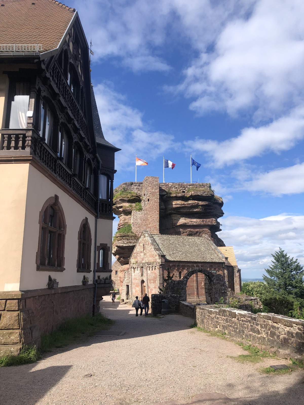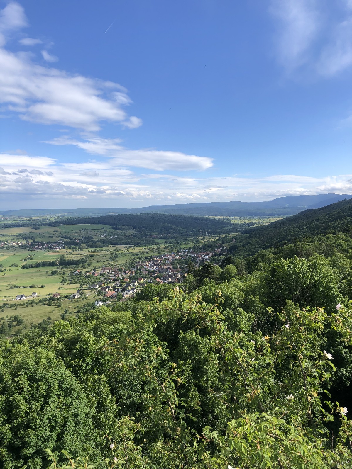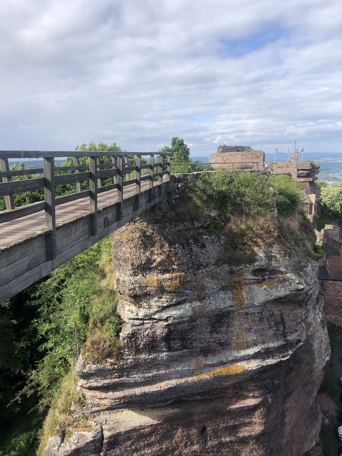 Comme son nom l’indique, le restaurant « Là-Haut » se situe en altitude, et plus précisément à 450 mètres sur les hauteurs de Saverne. Implanté au cœur du Château du Haut-Barr, il propose aux touristes comme aux locaux venus visiter les ruines médiévales une jolie pause gourmande. Alors avant de passer à table, n’hésitez pas à vous promener au sein de l’édifice, également appelé « l’œil de l’Alsace ». Il doit ce surnom au panorama incroyable qu’il offre sur la plaine d’Alsace, les Vosges, la Forêt Noire, et même, par temps dégagé, sur la Cathédrale de Strasbourg ! Le Château du Haut-Barr est en effet juché sur trois grands rochers. Pour atteindre le point culminant du site, il vous faudra gravir l’escalier en métal à l’arrière du restaurant, et traverser une passerelle en bois appelée « Pont du Diable ». Mon conseil si vous êtes sujet au vertige : respirez profondément, regardez droit devant vous et, une fois arrivé à destination : profitez ! La vue y est exceptionnelle.