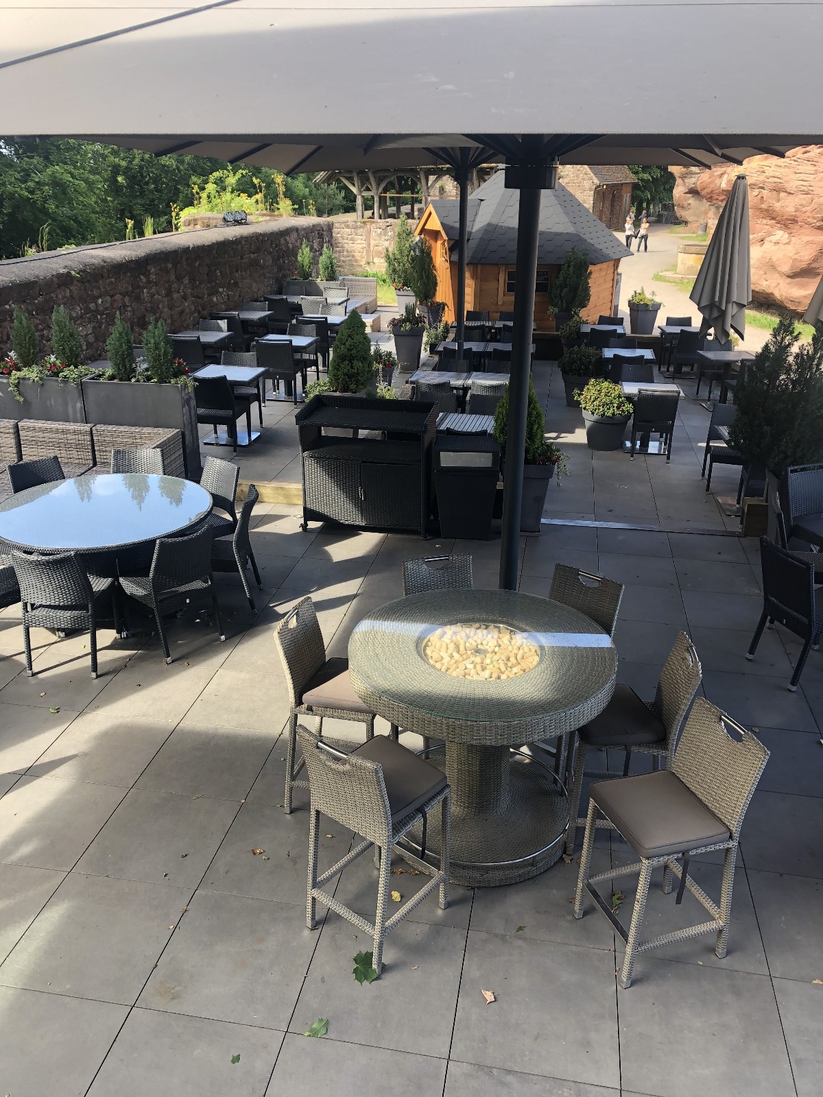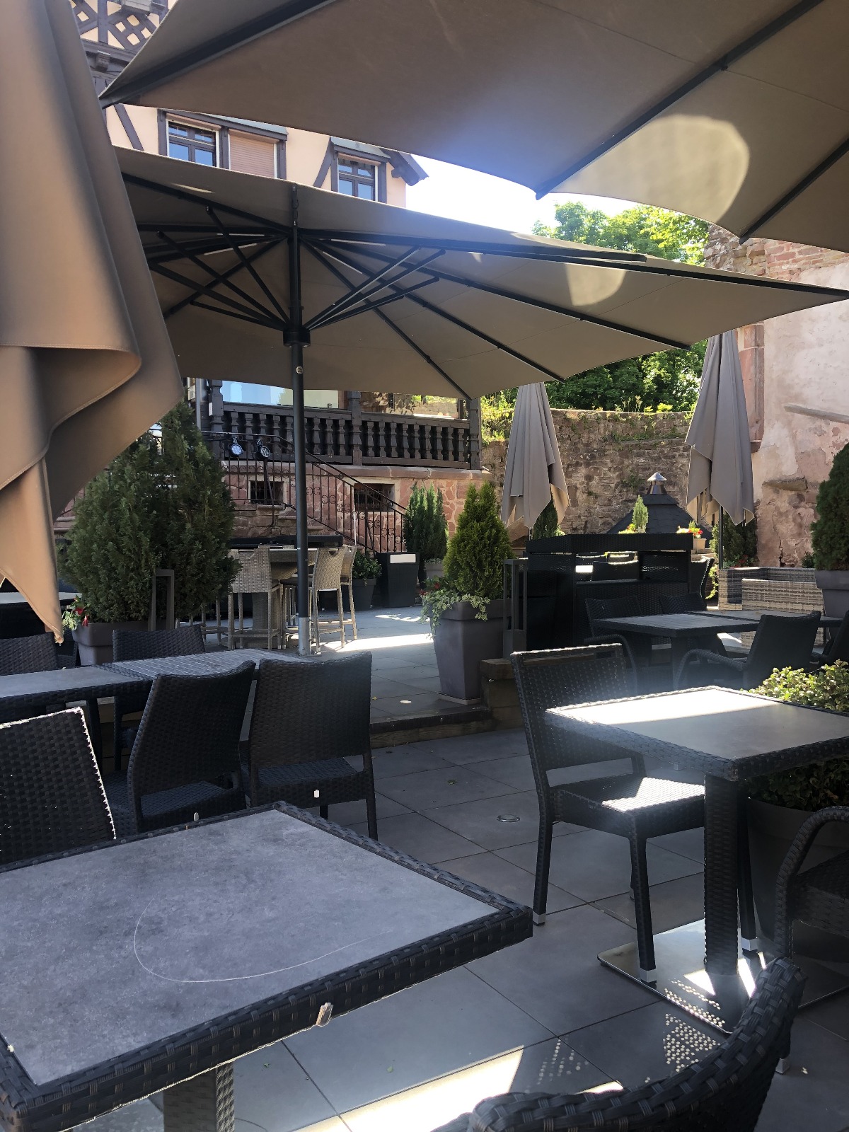 Du Château du haut-Barr érigé au VIIe siècle ne restent malheureusement qu’un logis seigneurial et une chapelle romane. C’est pourquoi le restaurant « Là-haut », avec son architecture mêlant poutres en bois sombre et gré rose, s’intègre parfaitement au lieu. On retiendra également sa large terrasse, implantée dans la cour de l’édifice. Entourée par les remparts du Château, elle offre à ses convives un espace de fraîcheur bien agréable pendant les vagues de chaleur estivale. Si on y retrouve immanquablement bon nombre de touristes, les locaux prennent également plaisir à s’y rendre. Ces derniers ont également pris l’habitude de privatiser la salle panoramique de l’établissement, pouvant recevoir jusqu’à 30 convives. Offrant une vue majestueuse sur la plaine d’Alsace, elle est particulièrement prisée pour les mariages, les communions et autres réunions de famille. Et en juillet – août, l’établissement transforme sa terrasse le weekend en un espace de clubbing : une belle occasion de venir danser littéralement sous les étoiles !